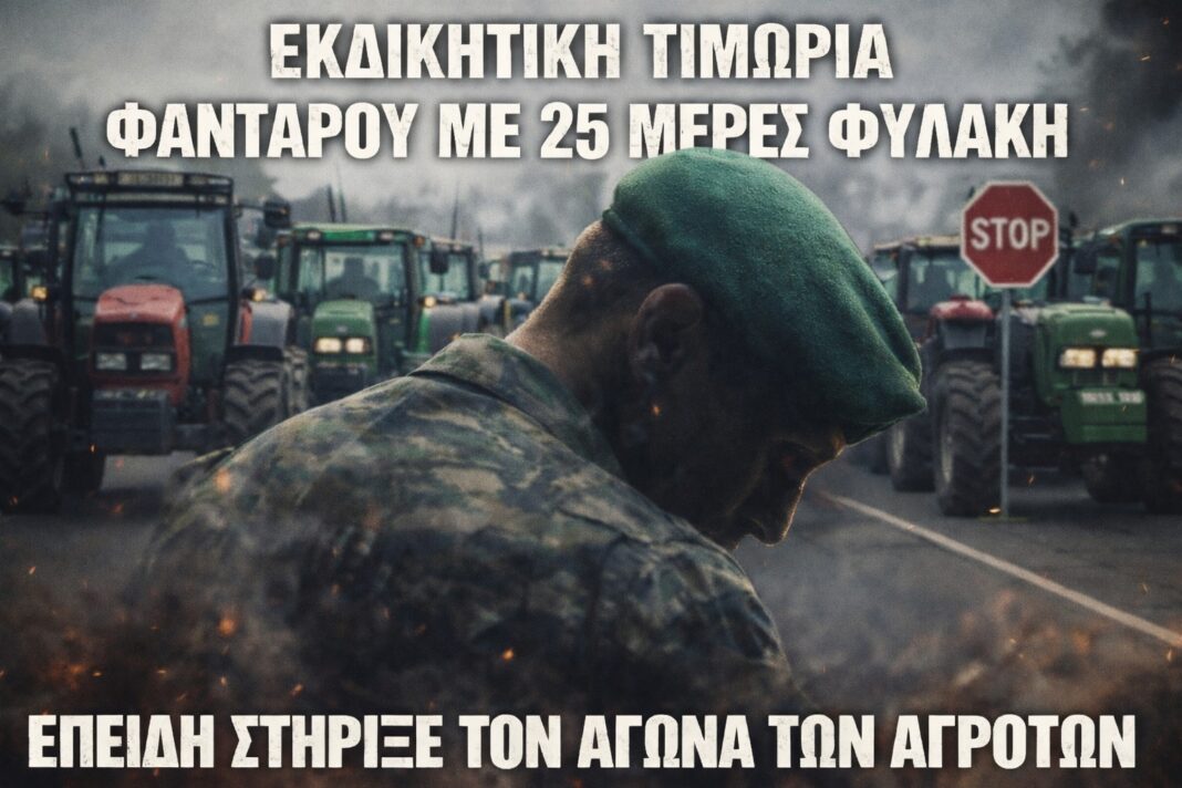 Μας προκαλεί αλγεινή εντύπωση η προσπάθεια τρομοκράτησης του, με την επιβολή ποινής, φυλάκιση 25 ημερών και αποπομπή του από τις Ειδικές Δυνάμεις, επειδή με τον χαιρετισμό του, στη μεγάλη συγκέντρωση των εργατικών σωματείων στο Σύνταγμα, ενάντια στον αντιλαϊκό προϋπολογισμό του πολέμου, που φτωχοποιεί παραπέρα τα λαϊκά στρώματα, εξέφρασε την αλληλεγγύη του στους αγωνιζόμενους αγρότες.