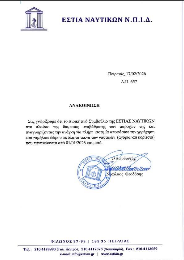 Σύμφωνα με την ανακοίνωση της ΕΣΤΙΑΣ ΝΑΥΤΙΚΩΝ Ν.Π.Ι.Δ. (17/02/2026), το Διοικητικό Συμβούλιο αποφάσισε, την επεκταση του γαμήλιου δώρου σε όλα τα τέκνα των ναυτικών (αγόρια και κορίτσια) που παντρεύονται από 01/01/2026 και μετά.