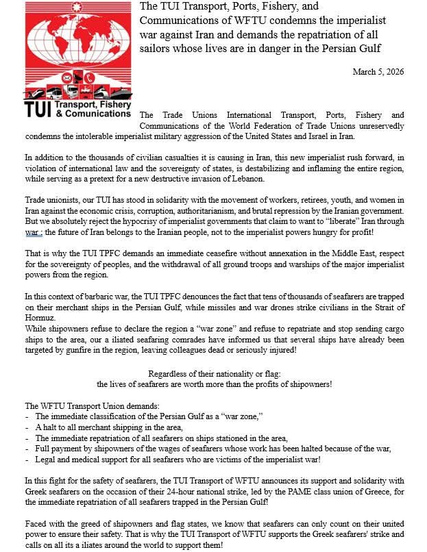 Ανακοινώσεις«Μήνυμα αλληλεγγύης για την απεργία από την Κλαδική Οργάνωση Μεταφορών της Παγκόσμιας... «Μήνυμα αλληλεγγύης για την απεργία από την Κλαδική Οργάνωση Μεταφορών της Παγκόσμιας Συνδικαλιστικής Ομοσπονδίας.» By Stefenson 7 Μαρτίου, 2026 4 FacebookTwitterPinterestWhatsApp Κοινοποίηση FacebookTwitterPinterestWhatsApp Προηγούμενο άρθροΧαιρετίζουμε την αλληλεγγύη που εκφράστηκε από σωματεία και φορείς του Πειραιά, για την απεργιακή κινητοποίηση μας. ΤΕΛΕΥΤΑΙΟ ΑΡΘΡΟ Ανακοινώσεις Καθολική συμμετοχή στην 24ωρη προειδοποιητική απεργία μας 6 Μαρτίου, 2026 Καταγγελίες ΧΩΡΙΣ ΓΡΑΜΜΑΤΕΙΑ Η ΣΧΟΛΗ ΤΩΝ ΜΗΧΑΝΙΚΩΝ Ε.Ν. ΣΤΗΝ ΑΕΝ ΑΣΠΡΟΠΥΡΓΟΥ 6 Μαρτίου, 2026 Ανακοινώσεις 24ΩΡΗ ΑΠΕΡΓΙΑ ΣΕ ΟΛΕΣ ΤΙΣ ΚΑΤΗΓΟΡΙΕΣ ΠΛΟΙΩΝ ΠΕΜΠΤΗ 5 ΜΑΡΤΗ, από 00:01’ έως 24:00’ 4 Μαρτίου, 2026 ΠΕΡΙΣΣΟΤΕΡΑ ΑΡΘΡΑ Ανακοινώσεις Χαιρετίζουμε την αλληλεγγύη που εκφράστηκε από σωματεία και φορείς του Πειραιά, για την απεργιακή κινητοποίηση μας. Stefenson - 7 Μαρτίου, 2026 Ανακοινώσεις Καθολική συμμετοχή στην 24ωρη προειδοποιητική απεργία μας Stefenson - 6 Μαρτίου, 2026 Καταγγελίες ΧΩΡΙΣ ΓΡΑΜΜΑΤΕΙΑ Η ΣΧΟΛΗ ΤΩΝ ΜΗΧΑΝΙΚΩΝ Ε.Ν. ΣΤΗΝ ΑΕΝ ΑΣΠΡΟΠΥΡΓΟΥ Stefenson - 6 Μαρτίου, 2026 Ανακοινώσεις 24ΩΡΗ ΑΠΕΡΓΙΑ ΣΕ ΟΛΕΣ ΤΙΣ ΚΑΤΗΓΟΡΙΕΣ ΠΛΟΙΩΝ ΠΕΜΠΤΗ 5 ΜΑΡΤΗ, από 00:01’ έως 24:00’ Stefenson - 4 Μαρτίου, 2026
