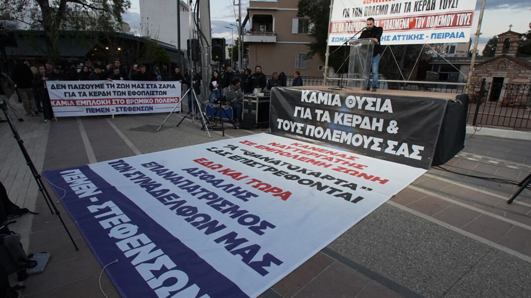 Έτσι και τώρα καλούμε τα Εργατικά Κέντρα, όλα τα σωματεία του Πειραιά, της Ελευσίνας, του Θριασίου, σε ιδιωτικό και δημόσιο τομέα, τους μαζικούς φορείς, που συναντηθήκαμε καιστο Σύνταγμα στις 27 Μάρτη, να διαδηλώσουμε και πάλι όλοι μαζί, ενάντια στην εμπλοκή της χώρας μας στον πόλεμο και τις συνέπειες που φορτώνουν στις πλάτες του εργαζόμενου λαού.